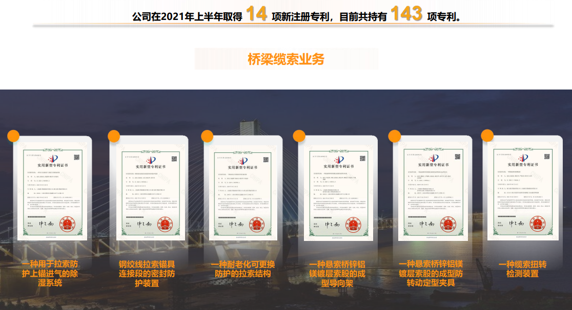对此,浦江一直以来持续投入研发加强自身技术,于上半年,公司已成功注册应用于桥梁缆索的新专利技术,包括新型耐热桥梁缆索,而上半年共取得14项新注册专利,目前共持有143项专利。