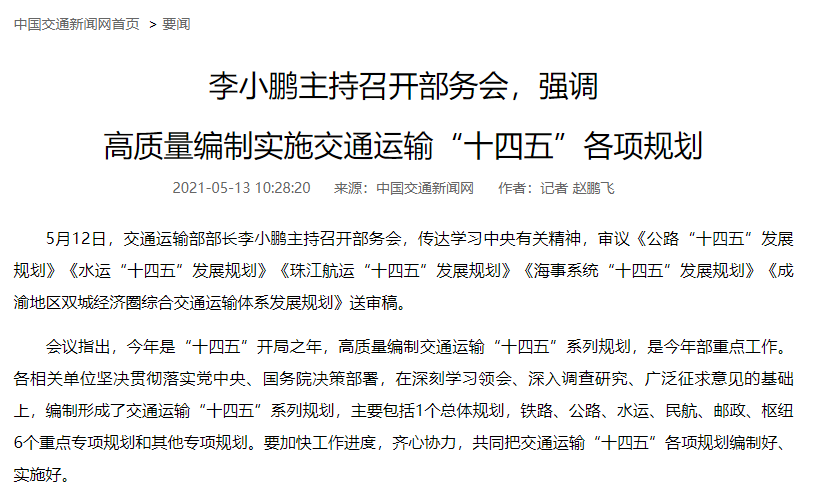 于今年6月30日,交通运输部部长李小鹏主持召开部务会,会议再次强调“十四五”时期是加快建设交通强国的第一个五年。