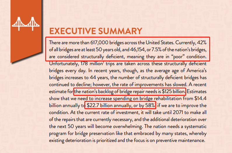 按最新估计,美国积压的桥梁维修需求金额达到1250亿美元,这数字已远超于拜登提案下的金额。