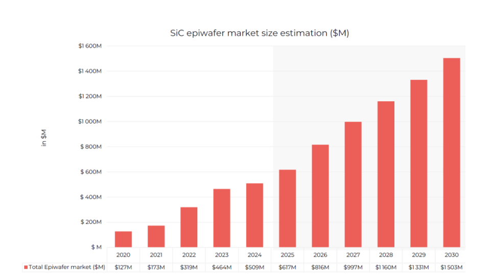 图2:SiC外延市场规模预测。Yole2025年度报告显示,到2030年,全球SiC外延市场规模约15亿美元。外延重要,但本质上仍是器件制备过程中的工艺环节。】
