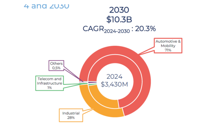【图1:SiC功率器件市场预计将从2024年的约34亿美元增长至2030年的约103亿美元,其中汽车与出行仍是核心应用场景。高功率场景的广阔空间,是SiC相较GaN更重要的产业基础之一。】