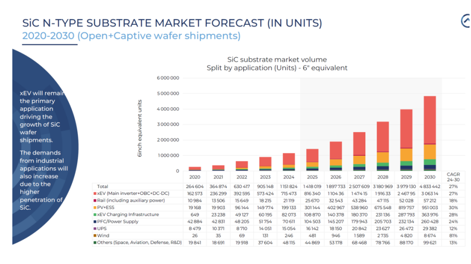 【图3:全球SiC导电型衬底需求持续增长,2030年出货量预计接近500万片(6英寸等效)。衬底作为更上游的基础材料环节,直接受益于新能源汽车、光储充等需求扩张。】